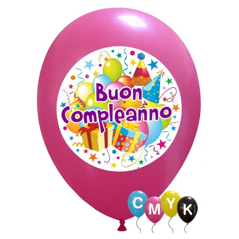 Palloncini in lattice perfetti per un compleanno, stampati su di essi troviamo la scritta buon compleanno circondata da regali e festoni il tutto in versione full color (CMYK).