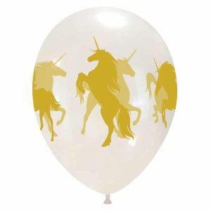 Palloncini trasparenti e neri da 12 pollici con siluette dorate di unicorni stampate su ogni lato. Questo prodotto è disponibile in colori separati o in un comodo mix.