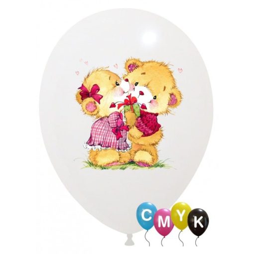 Palloncini in lattice perfetti per San Valentino, al centro troviamo due teneri orsetti mentre si scambiano un regalo, il tutto stampato in versione full color (CMYK).