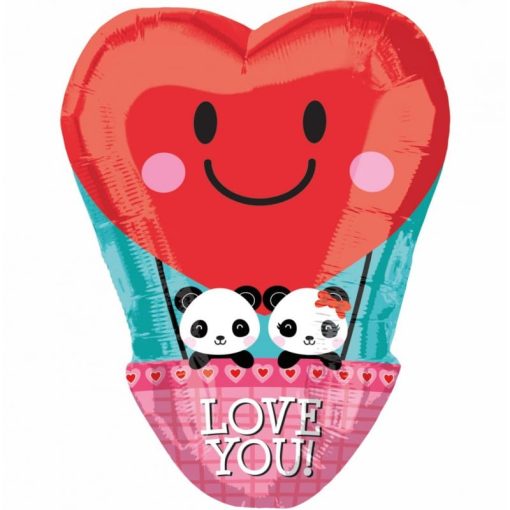 Palloncini mylar da 18 pollici perfetti come regalo per la persona amata, hanno la forma di una mongolfiera il cui pallone è un cuore, e all’interno del cesto troviamo 2 teneri panda.