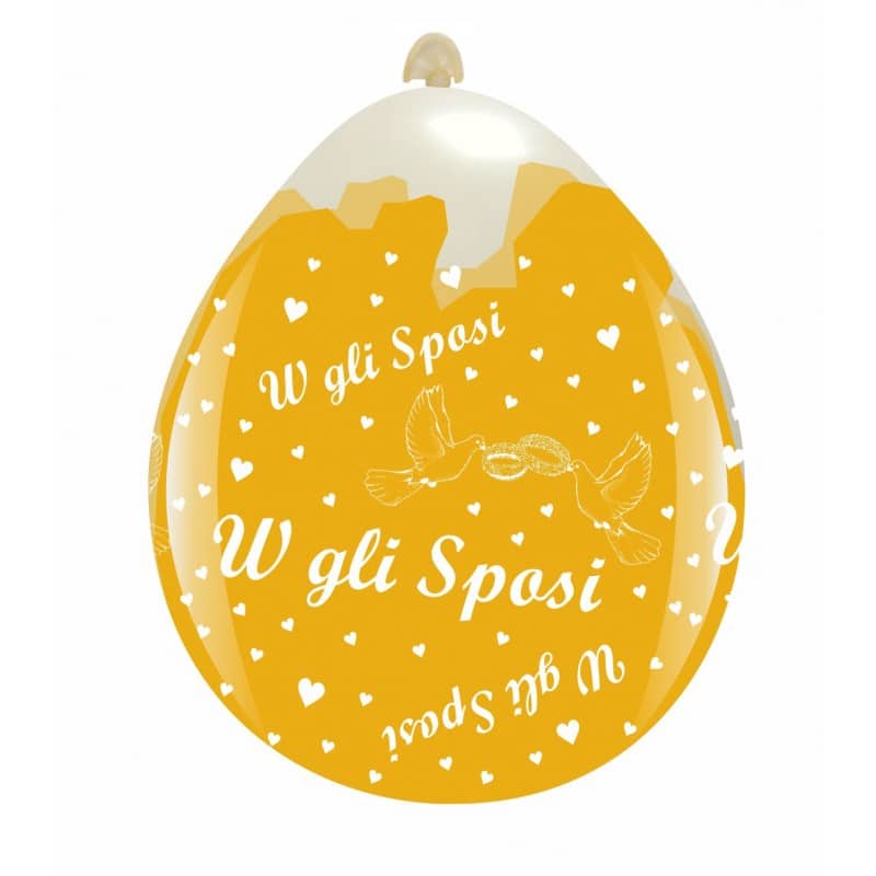 Palloncini stuffer da 18 pollici per matrimoni. La frase “w gli sposi” circondata da cuori e colombe, è stampata su tutto il palloncino.